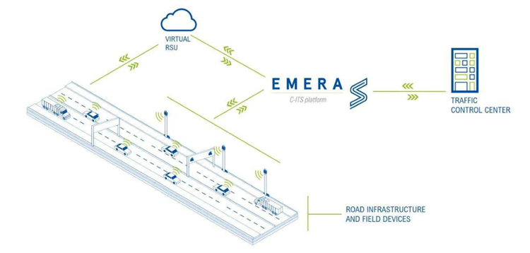 SINELEC supports road operators in managing this new concept of mobility, offering them the tools to define their own road-map towards the future. EMERAS, the SINELEC C-ITS platform, allows a real-time bidirectional dialogue between vehicles and infrastructure and it guarantees the integration between road ITS devices and traffic control centers. Additionally, EMERAS collects and aggregates the information related to the existing scenario, soon activates pre-established response plans and spreads an immediate geolocated dissemination of the message addressed to the enabled vehicles, "just in time in the right place". The information exchange with the vehicles is possible because the OBUs (On- Board Units) communicate with the RSUs (Road Side Units), either physical or virtual, connected to the platform through an integration layer able to manage any communication protocol (DSRC/ITS - G5 or 4G/5G).